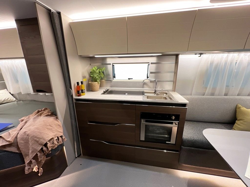 Voiture familiale très appréciée et complète avec une chambre d’enfants à l’arrière, composée de 3 couchages et d’un coin salon cosy. Salle de bain avec WC et douche, ainsi qu’un lavabo rabattable et un lavabo design sur le siège extérieur des toilettes à côté du lit double. Le coin cuisine est bien équipé et dispose de nombreux rangements, d’un grand réfrigérateur avec compartiment congélateur séparé, d’un four, d’un micro-ondes et de 3 plaques électriques. Le salon lui-même est situé à l’avant sous la grande lucarne.