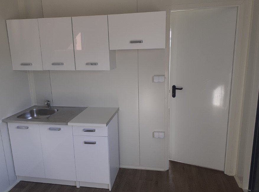 • Cuisine/salle à manger : Installation électrique (5 prises, 1 interrupteur, éclairage LED), ventilation, kitchenette avec 5 meubles blancs brillants, réfrigérateur sous plan, porte extérieure en acier, fenêtres PVC double vitrage avec volets roulants extérieurs, convecteur.